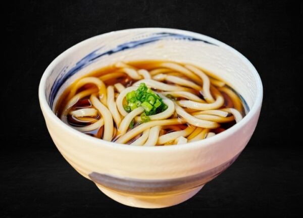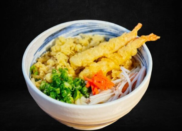 Udon noodles in a savory broth, topped with crispy tempura flakes and 2 pieces of shrimp tempura for a satisfying crunch.
