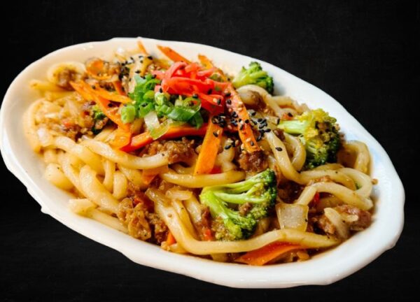 Stir-fried udon noodles with fresh vegetables and savory sauce, delivering a flavorful and satisfying meal.